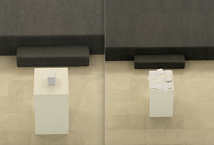 GPI audiences are invited to participate in the work and activate the circulation of possible narratives through a multimedia installation. GPI exchanges roles between audience and artist. A pre-recorded soundscape reciting a poem plays in the space and is re-sequenced on printed matter with isolated sentences by participants. Through their active engagement audiences were implicated into the work and its dissemination beyond the physical space by taking resequenced printed matter out of the space. The poems and short stories are part of an ongoing collection written by the artist called ‘A Sphinx Looking for a Poet’.
