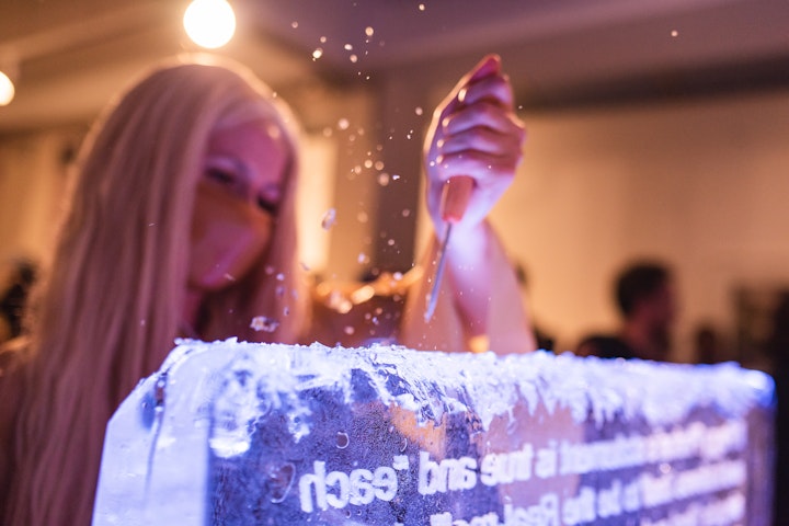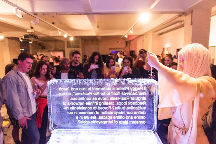Throughout the night the ice sculpture Intrapsychic Crisis was chipped away and given to the audience to keep their drinks cold, the conventional function of ice. The work is physically and conceptually dismantled by me (in the role of the performer) and everyone else (in the role of the audience) pushed the process further by ultimately drinking the work with my permission. The ice from the sculpture met cocktails created for Yinka Shonibare in the audience's glasses. The text presented is the conclusive paragraph of an unpublished essay exploring the performance The Difference Between (a Mirage and Realness) exhibited as part of Touch Sensitive at Guest Projects in 2017.